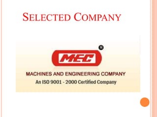 MEC is a leading producer of engineering machines based in Coimbatore, generating an annual turnover of 250 crores and emphasizing innovation and customer satisfaction. The company exports its products to over 40 countries and is ISO 9001-2000 certified, offering high-quality concrete and brick-making machines. MEC focuses on employee welfare with direct recruitment and a supportive work environment, while utilizing various marketing techniques to maintain its market presence.