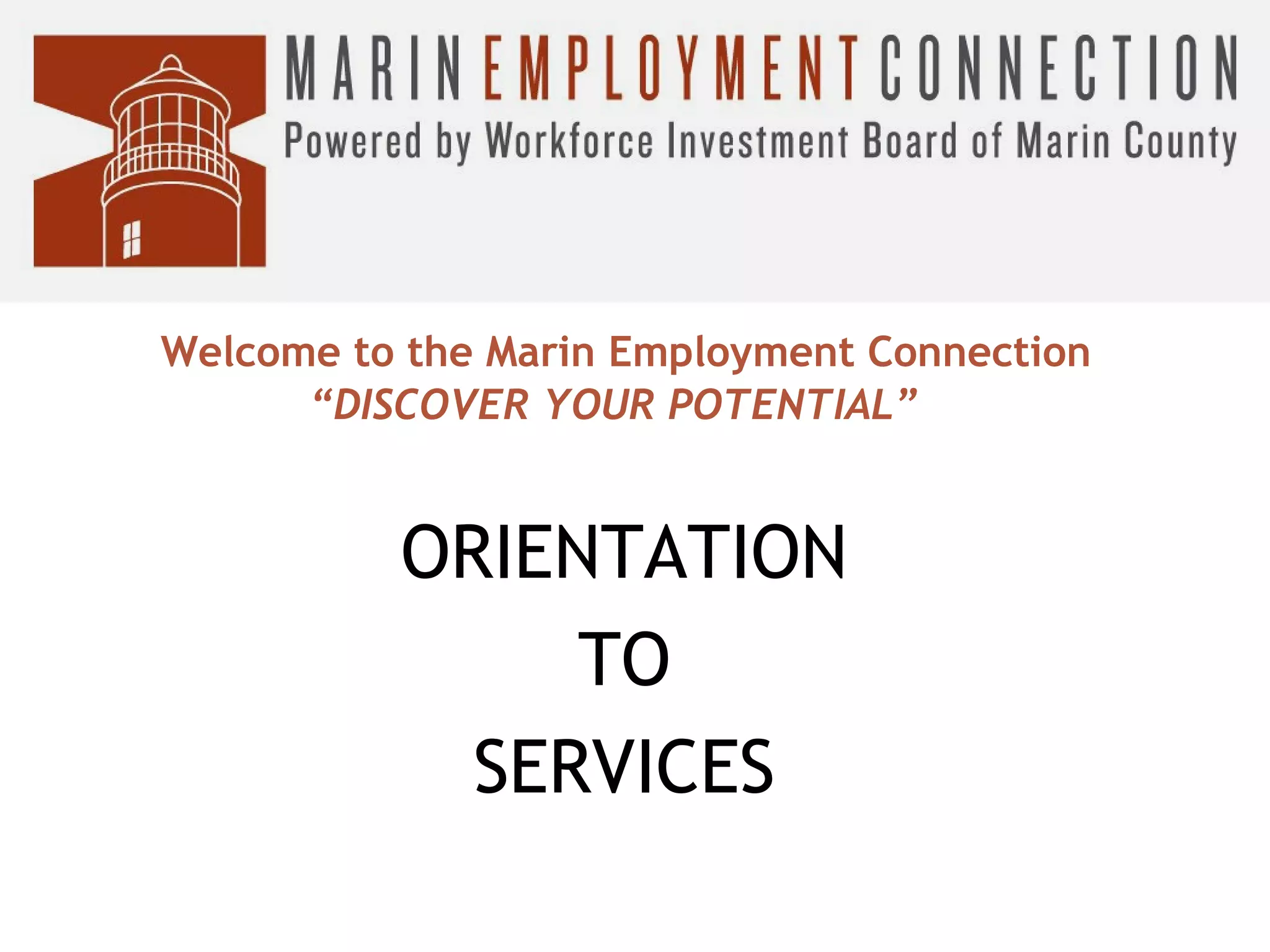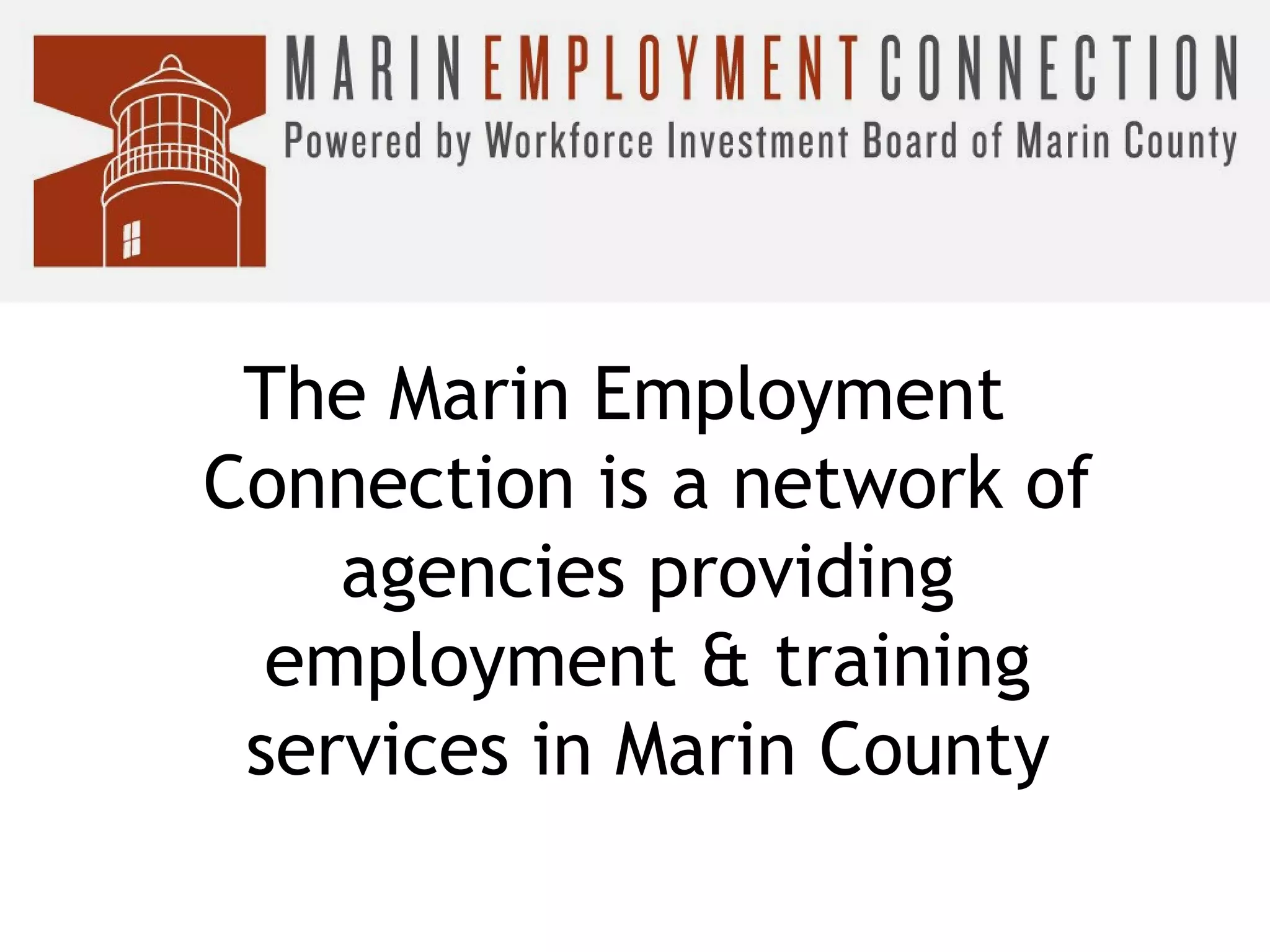 The Marin Employment Connection provides employment services through a network of agencies in Marin County. It offers various services to help with job searches, including job workshops, training programs, funding for education, youth services, and services for employers and Spanish speakers. Services are free and available at the Career Resource Center, including use of computers, phones, unemployment assistance, and more. Orientation sessions provide information on all available services.