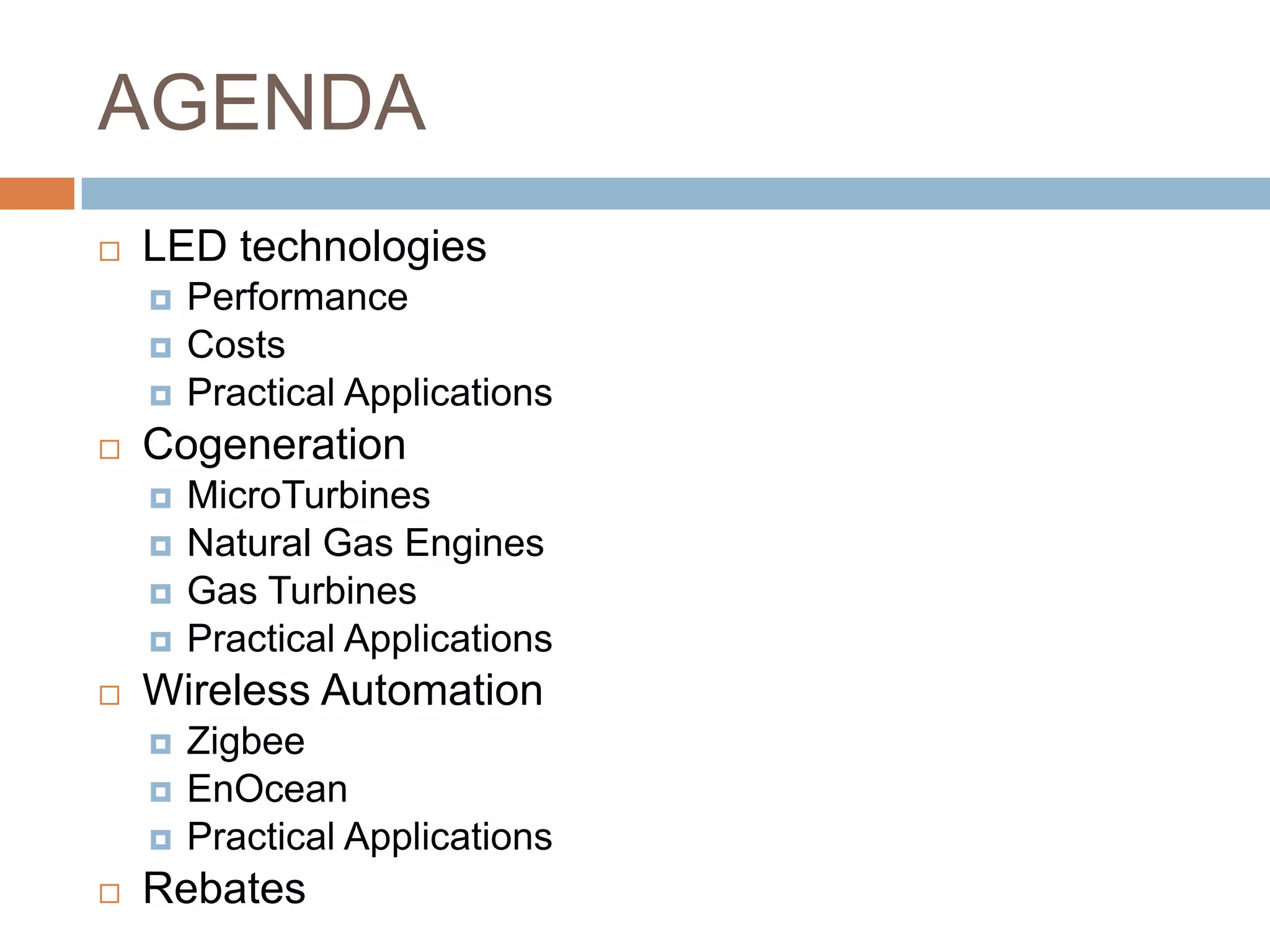 This document summarizes strategies for reducing energy consumption in facilities through newer technologies like LED lighting, cogeneration, and wireless automation systems. It discusses the cost and benefits of these technologies, where they can be applied, and available funding to assist with return on investment. The presentation covers LED lighting technologies and applications, different types of cogeneration systems from microturbines to gas turbines and their applications, and uses of wireless automation using technologies like Zigbee and EnOcean. It provides examples of calculating return on investment for these systems and discusses available rebates.