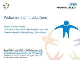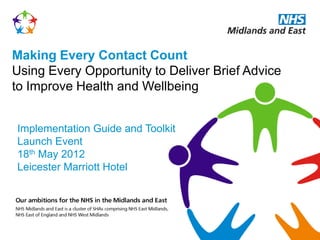 The document outlines a launch event for the Making Every Contact Count (MECC) initiative in the Midlands and East of England. It discusses the evidence and potential impact of MECC, which encourages healthcare staff to use brief conversations to promote healthy behaviors. Staff and patients were interviewed about MECC and generally supported it if advice was brief, from any staff type, and in the right environment. Training was seen as important for staff to feel confident providing advice. The implementation guide and toolkit for MECC was then presented, outlining an organizational process for effective implementation.