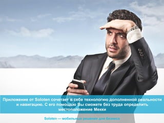 Soloten предлагает мобильное приложение для определения местоположения Мекки, использующее дополненную реальность и навигацию. Приложение включает функции уведомлений о времени молитвы и создано для повышения эффективности бизнеса. Компания имеет международную команду с большим опытом в разработке и продвижении мобильных решений.