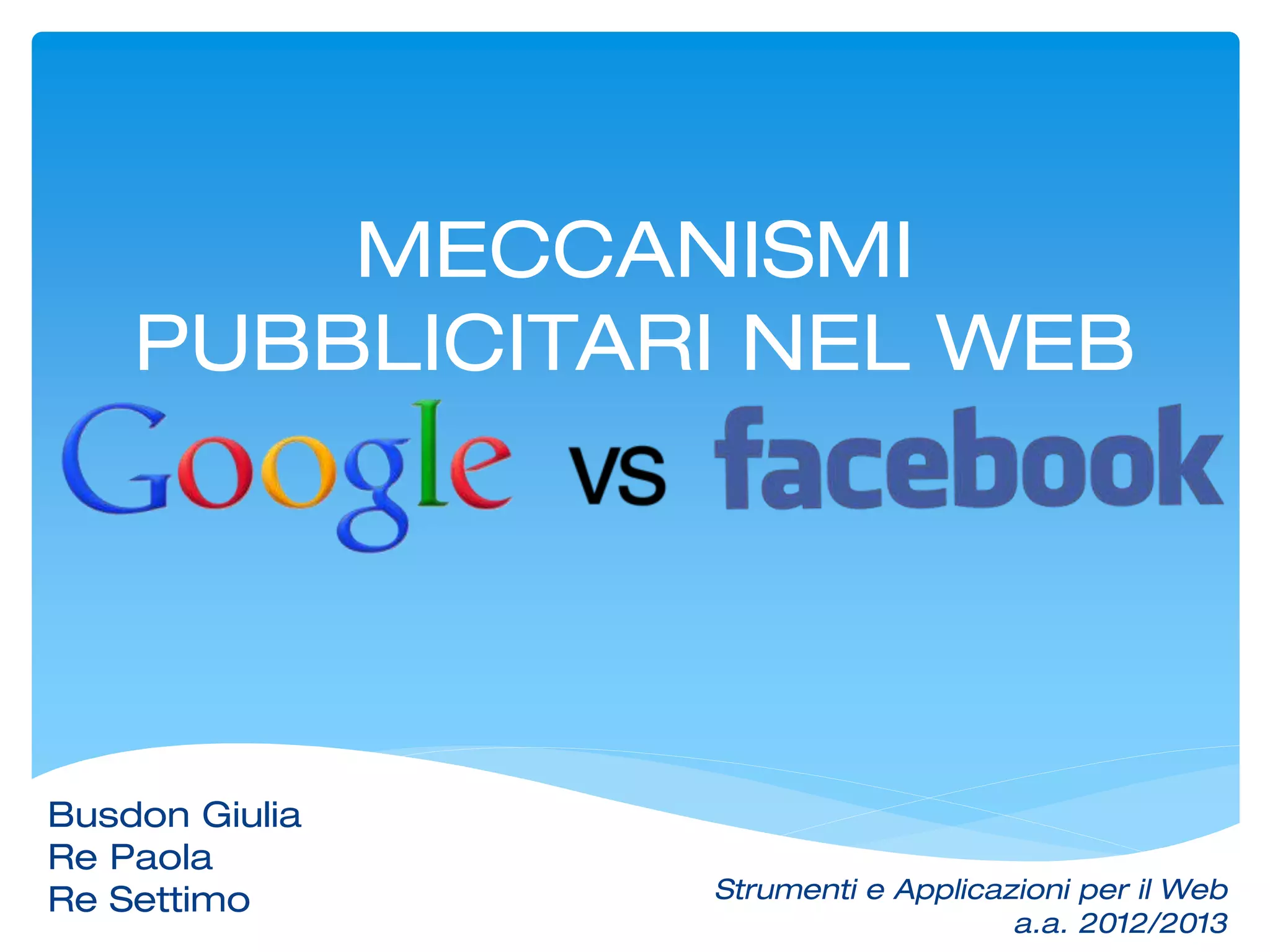 Il documento esplora i vari meccanismi di pubblicità sul web, evidenziando i vantaggi della tracciabilità dei risultati e le diverse tipologie di pubblicità, come quella assertiva, periferica e interna. Viene anche presentato il funzionamento degli strumenti pubblicitari di Google, come Adsense e Adwords, che permettono ai publisher di monetizzare i contenuti attraverso annunci mirati. Infine, analizza le strategie pubblicitarie di Facebook, sottolineando l'importanza della definizione del target e dei costi associati ai diversi metodi di pubblicità.