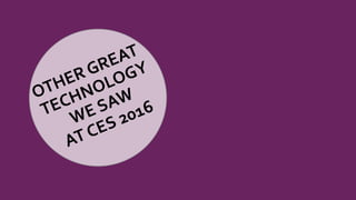 The document summarizes key highlights from the 2016 Consumer Electronics Show (CES). It discusses how the event attracted over 170,000 attendees and 3,500 exhibitors showcasing emerging technologies. Major themes included connected living, the Internet of Things, smart technology, automated vehicles, and higher quality content. Virtual and augmented reality were also prominent. The document also summarizes new innovations in wearable technology, including smart garments and health/fitness trackers, as well as advances in automotive technology like autonomous vehicles and enhanced connectivity.