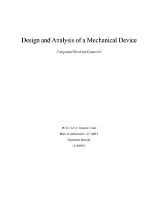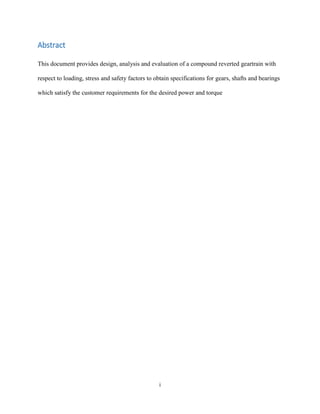 This document provides specifications for a compound reverted gear train with two stages of gear reduction. It determines gear sizes and tooth counts that satisfy the required input and output speeds and torque ratios. An analysis of forces and stresses is performed on the intermediate shaft to specify its diameter and design. Bearing types and sizes are selected. Safety factors are calculated to evaluate the design. Specifications for gears, shafts, bearings and other components are provided to meet customer requirements within size, power and life constraints.