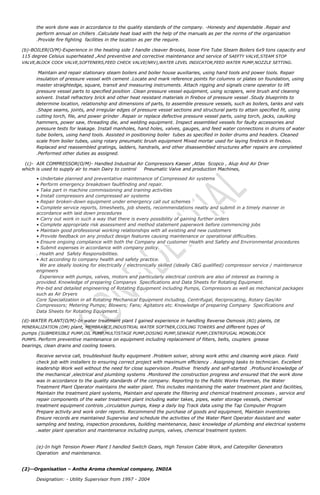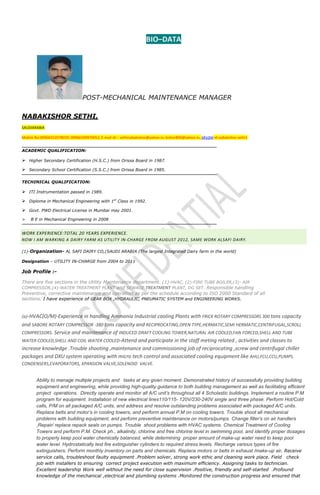 The document is a bio-data for Nabakishor Sethi, who is applying for the position of Post-Mechanical Maintenance Manager. It outlines his academic and technical qualifications which include an ITI, diploma in mechanical engineering, and B.E. in mechanical engineering. It details his 20 years of work experience, most recently as Utility In-Charge at Al Safi Dairy, the largest dairy farm in the world. It provides a job profile describing his experience maintaining and operating HVAC, boiler, air compressor, and water treatment plant systems and equipment.