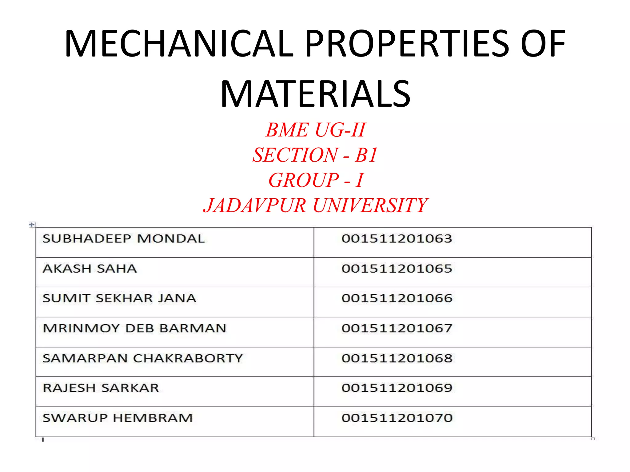 Mechanical properties refer to how materials behave under forces or pressures. This document discusses key mechanical properties including brittleness, hardness, strength, stiffness, ductility, malleability, elasticity, plasticity, creep, and weldability. It describes how these properties are defined, measured, and their significance for material selection and design. Measurement techniques covered include indentation hardness tests like Rockwell and Brinell, and tension tests. The document also examines stress-strain diagrams and how they vary for different materials and temperatures.