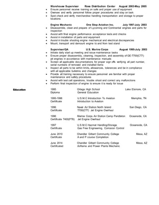 Andres Villalobos is an experienced aircraft mechanic seeking a position. He has over 20 years of experience as an A&P mechanic, team lead, and quality assurance specialist for military and civilian aircraft. He is skilled in inspecting, maintaining, and repairing engines and aircraft in accordance with maintenance manuals. Villalobos aims to provide the highest quality and professionalism with a focus on safety.