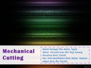 Mechanical cutting uses power-driven machines like lathes, milling machines, and drill presses to shape and form materials according to a predetermined design. Some common tools for cutting sheet metal include hand shears, bench shears, shear machines, and nibblers. Bench shears can be used to cut straight lines, curves, and shapes in mild steel plates up to around 1.6 mm thick. Different tools are suited for cutting different materials and thicknesses.
