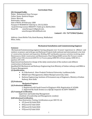 Mohammed Umar Faruque is an Indian mechanical installation and commissioning engineer with over 16 years of experience in power, oil & gas, and railway projects, both nationally and internationally. He holds a B.E. in Mechanical Engineering and an MBA in Project Management, and is registered with the Saudi Council of Engineers, approved by Saudi Aramco as a QA/QC inspector. Currently, he works with Poyry Switzerland Ltd on the Shuqaiq Steam Power Project, supervising mechanical installation and inspection activities.