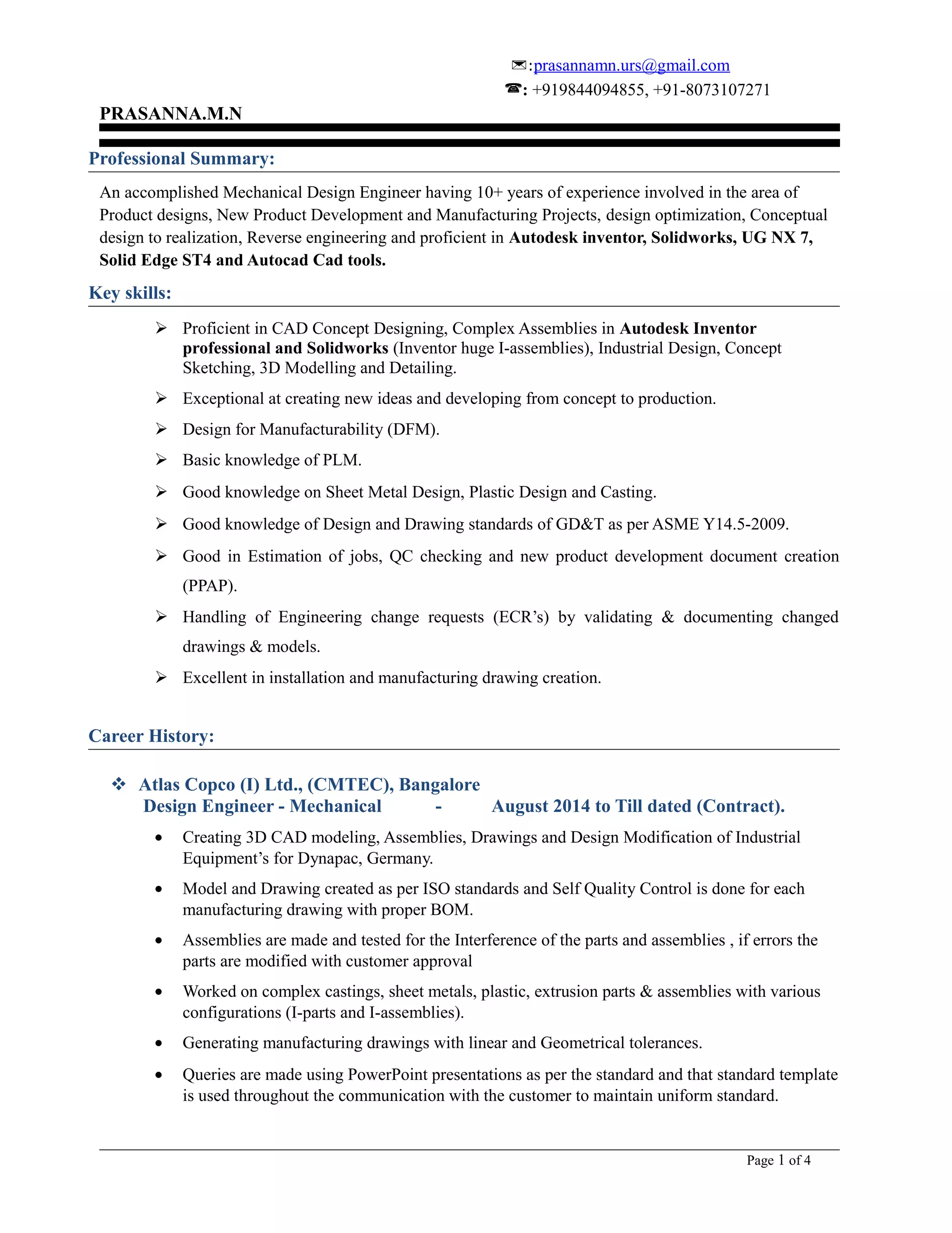 This document contains a summary of Prasanna M.N.'s professional experience as a Mechanical Design Engineer, including 10+ years of experience in product design, new product development, manufacturing projects, and design optimization. It outlines his key skills such as CAD modeling, complex assemblies, design for manufacturability, and knowledge of engineering standards. It also provides details of his career history working for various companies on projects like mobile feeders, compact asphalt machines, and pressure vessels. His education includes a B-Tech in Mechanical Engineering and a Diploma in Mechanical Engineering. Contact information and personal details are also included.