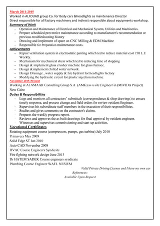 Tamer Kadry Ibrahiem is a mechanical engineer with over 8 years of experience in various industrial fields. He has a Bachelor's degree in Mechanical Power Engineering and additional qualifications in refrigeration and air conditioning. Currently he works as a site engineer for the MIVIDA project in New Cairo, where his responsibilities include supervising contractors, reviewing submittals and drawings, and witnessing commissioning activities. Prior to this, he held maintenance and engineering roles for companies in various sectors such as automotive, contracting, and healthcare.