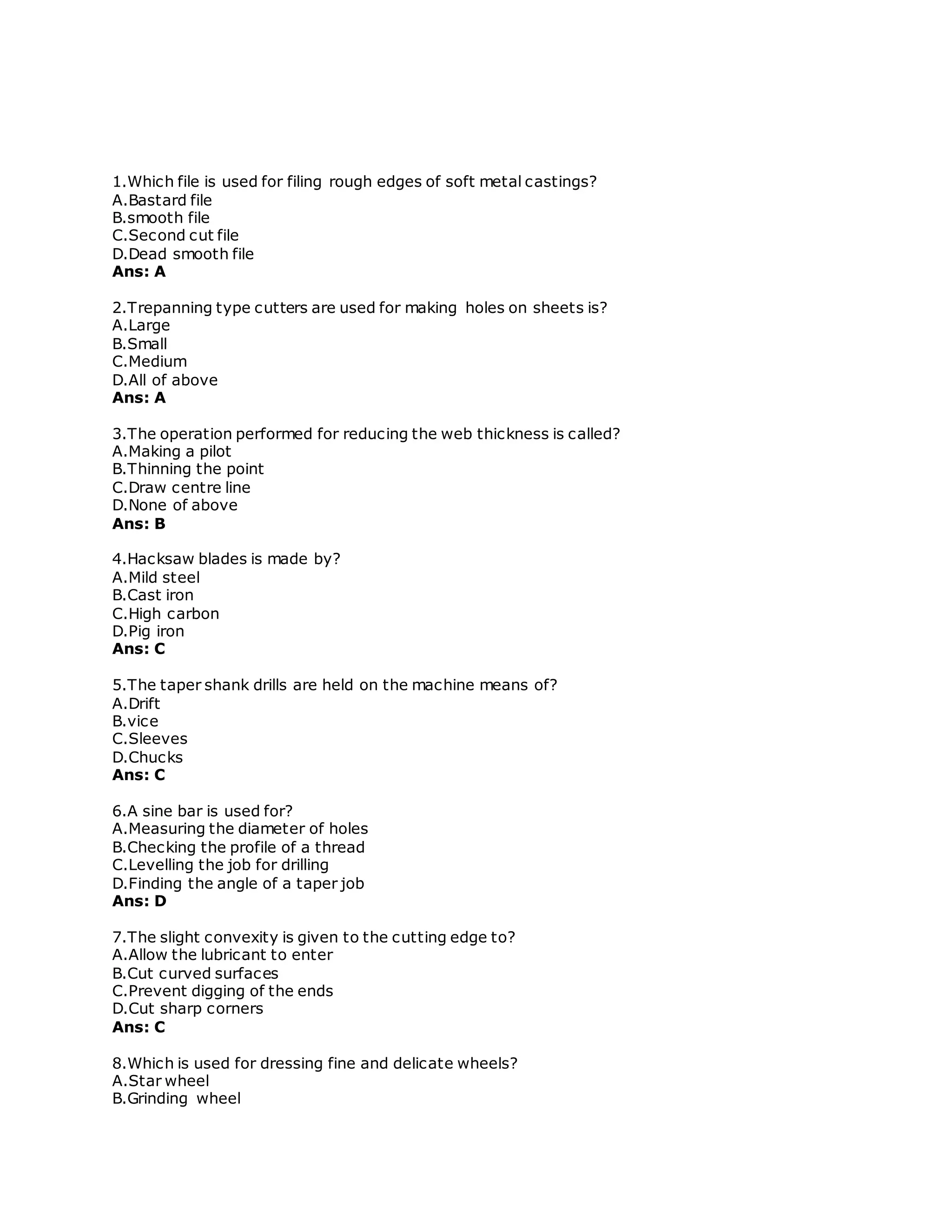 This document contains 70 multiple choice questions related to tools and manufacturing processes. The questions cover topics like files, drills, reamers, sine bars, micrometers, and more. They assess knowledge of what different tools are used for, standard sizes and specifications, common manufacturing terms, and other fundamental concepts in machining and metrology.