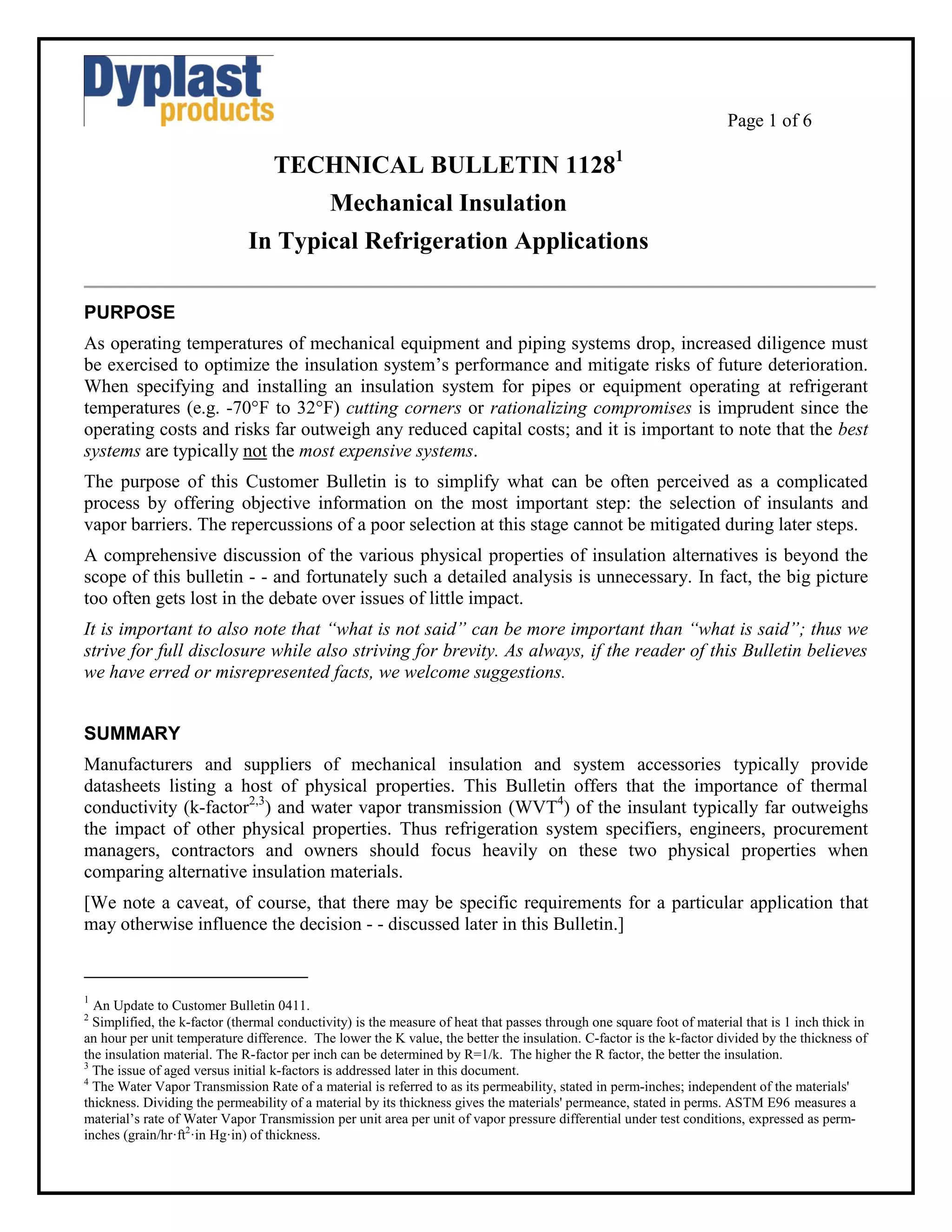This technical bulletin emphasizes the importance of selecting proper insulation materials and vapor barriers in refrigeration applications to optimize performance and reduce costs. Key considerations include thermal conductivity and water vapor transmission rates, as they significantly affect energy efficiency and overall operational costs. The bulletin also discusses the advantages of specific insulation types, such as Dyplast's ISO-C1® polyisocyanurate, and the critical role of vapor barriers in protecting insulants from moisture intrusion.