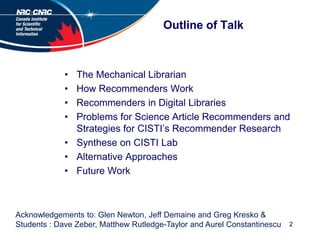 The document outlines Andre Vellino's talk on recommending journal articles in a scientific digital library. The talk covers an overview of recommender systems, how they work, examples of recommender systems used in digital libraries, and challenges for recommender systems in scientific digital libraries. It also provides details on CISTI's recommender research strategy, including using citation data and PageRank to address data sparsity issues. The document includes outlines of the talk sections and examples of the Synthese recommender system developed at CISTI Lab.