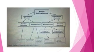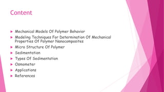 This document discusses mechanical models of polymer behavior, modeling techniques for determining mechanical properties of polymer nanocomposites, microstructure of polymers, sedimentation, osmometry, and their applications. It describes continuum and molecular modeling methods, how microstructure affects composite behavior, sedimentation processes and tank types, how osmometers measure osmotic strength, and applications in medicine, research, and industry.