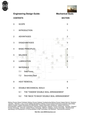 The document provides information on mechanical seals used in engineering applications. It discusses the basic principles of how mechanical seals work, including balance, lubrication, materials selection and heat removal considerations. Mechanical seals are an alternative to packed glands for sealing rotating shafts, with advantages of reduced maintenance costs and leakage but also higher costs and less tolerance for misalignment than packed glands. Key factors that influence the performance of mechanical seals are proper balance to control pressures, adequate lubrication of the seal faces, suitable materials selection based on wettability and corrosion resistance, and removal of frictional heat generated during operation.