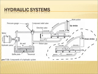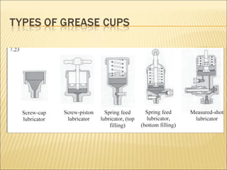 The document details the importance of machinery maintenance, highlighting the need for routine tasks like inspection, lubrication, and part replacement to prevent wear and machine failure. It explains the role of lubricants, particularly oil and grease, in reducing friction and extending the lifespan of components, as well as discussing different types of lubrication systems. Additionally, it covers failure causes and the significance of regular maintenance in hydraulic and pneumatic systems to ensure operational safety.