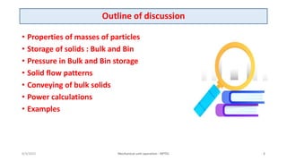 The document discusses mechanical unit operations related to the storage and conveying of bulk solids. It covers topics like the properties of bulk solids, different types of storage methods (bulk and bin storage), solid flow patterns, and methods of conveying bulk solids. Specifically, it describes the pressure characteristics in bulk and bin storage, the three main solid flow patterns (mass, funnel, and expanded flow), and the main types of conveyors used for bulk solids including belt, chain, screw, and pneumatic conveyors.
