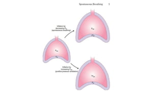 This document discusses mechanical ventilation and the mechanics of breathing. It explains that breathing can occur spontaneously through the work of respiratory muscles, or through positive pressure ventilation using devices like endotracheal tubes. The balance between the lungs' elastic recoil inward and the chest wall's recoil outward determines the lung volume. Transpulmonary pressure, the difference between alveolar and pleural pressures, controls lung volume and inflation. Boyle's law states that for a fixed amount of gas, pressure and volume are inversely proportional.