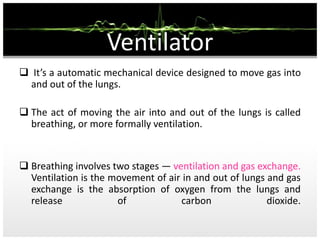 This document discusses mechanical ventilation. It begins by defining ventilation and the parts of a ventilator. It then covers the history of mechanical ventilation and describes various ventilator modes and settings such as PEEP, tidal volume, and inspiratory/expiratory ratio. The document outlines indications for ventilation and discusses monitoring ventilated patients. Key steps in ventilation like initiation, sedation, and weaning are summarized.