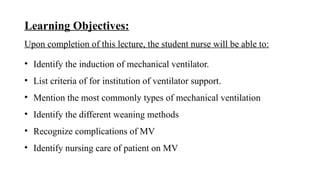 This document outlines the objectives and definitions related to mechanical ventilation, including indications, types, and modes of ventilation, as well as criteria for instituting ventilatory support. It discusses various ventilator settings, weaning methods, potential complications, and nursing care for patients on mechanical ventilation. Additionally, the document emphasizes the importance of ongoing assessment of both the patient and the ventilator to ensure proper functioning and patient safety.