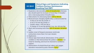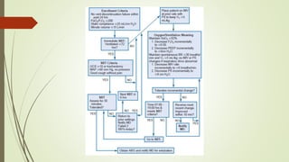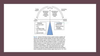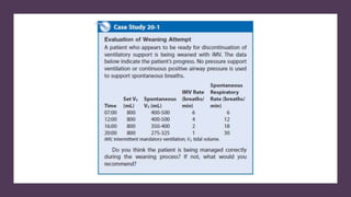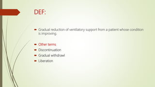 - Weaning involves gradually reducing ventilatory support as a patient's condition improves to avoid complications of prolonged ventilation.