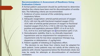 The document discusses guidelines and recommendations for weaning patients from mechanical ventilation and discontinuing ventilator support. Some key points covered include: