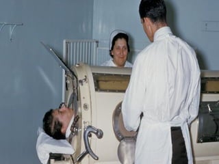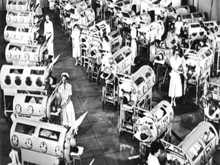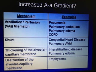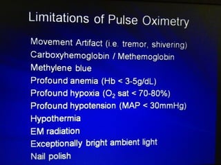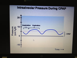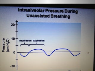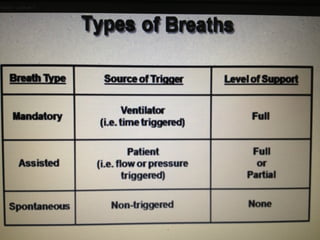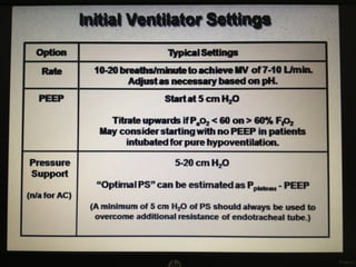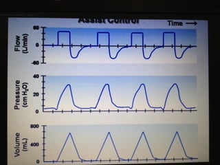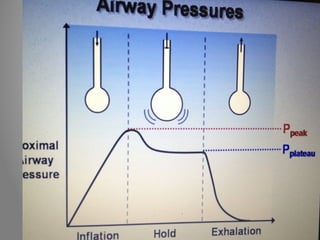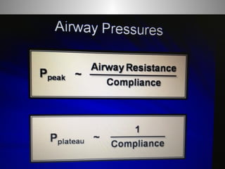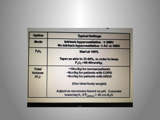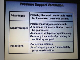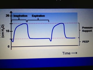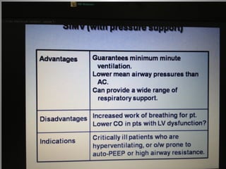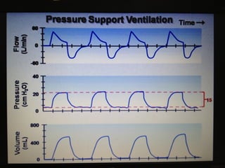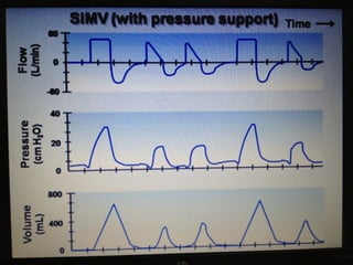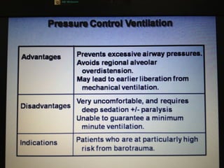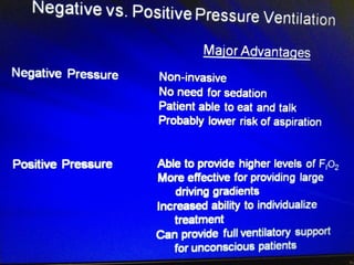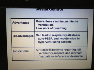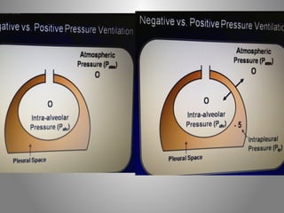 Mechanical ventilation is a therapeutic method that uses physical devices to assist or replace spontaneous breathing. There are two main types: negative pressure ventilation which applies pressure lower than atmospheric to the chest, and positive pressure ventilation which applies pressure higher than atmospheric to the lungs. Positive pressure ventilation is more commonly used today. It is important to carefully monitor patients on mechanical ventilation to optimize ventilation and prevent lung injury, through monitoring pressures, volumes, oxygen levels and CO2 levels. The goals are to provide adequate gas exchange while applying the lowest possible pressures and volumes to the lungs.