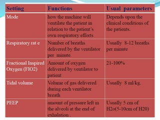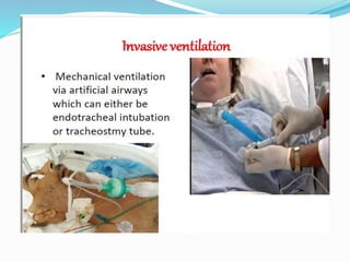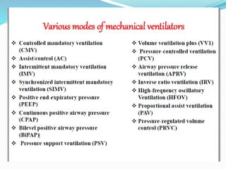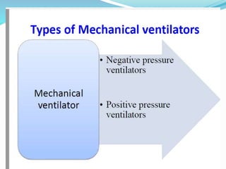 The document provides an overview of mechanical ventilation including its basic principles, types, indications, purposes, modes, settings, advantages, complications, weaning process, and nursing care of patients on ventilators. Mechanical ventilation delivers mechanically generated breaths to oxygenate the blood and remove carbon dioxide. It can be invasive or non-invasive. Modes include controlled mandatory ventilation, synchronized intermittent mandatory ventilation, pressure support ventilation, continuous positive airway pressure, and bi-level positive airway pressure. Nurses monitor patients closely, assess readiness for weaning, and provide comfort during the process.