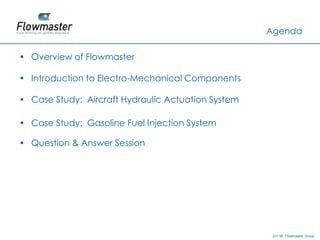 This document provides an overview of modeling mechanical system interactions using Flowmaster software. It begins with an agenda that includes an overview of Flowmaster, introduction to electro-mechanical components, and case studies on an aircraft hydraulic actuation system and gasoline fuel injection system. The document then discusses Flowmaster's capabilities for analyzing incompressible and compressible fluids, steady state and transient scenarios, and its applications in aerospace, automotive, gas turbine, and oil and gas industries. It provides examples of modeling mechanical-fluid interactions and introduces concepts of fluid transients and pressure waves. Finally, it discusses challenges in modeling mechanical systems such as sizing, survivability, and system interactions.