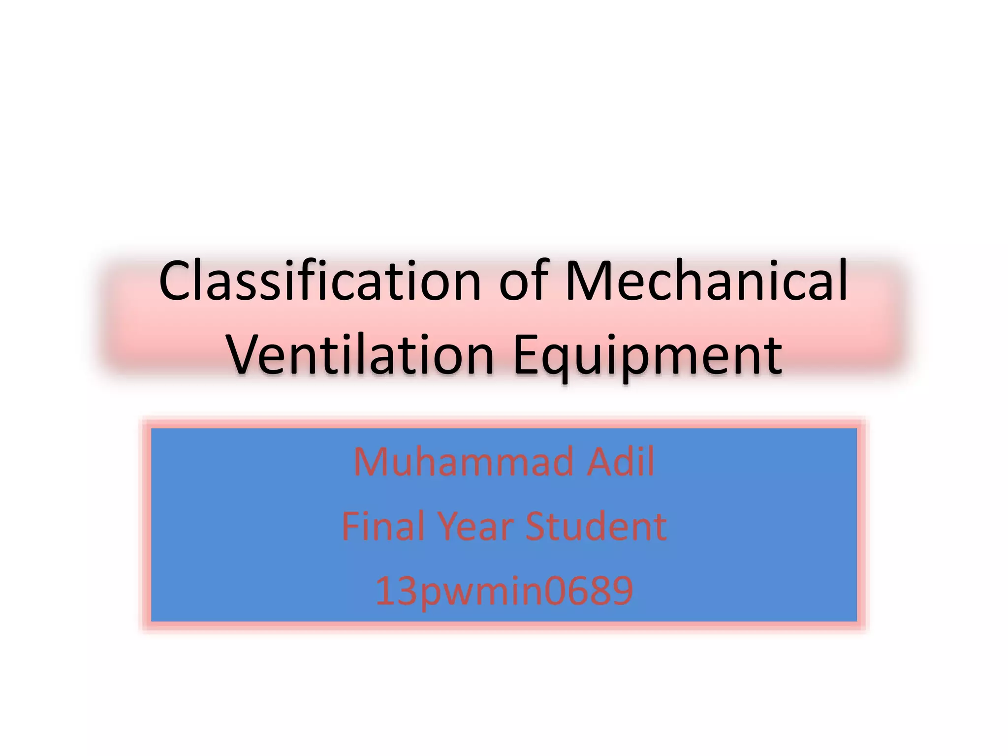 Mechanical ventilation equipment includes fans, compressors, and injectors. Fans are the most common and important type and can be centrifugal, axial flow, or mixed flow. Centrifugal fans draw air into a rotating impeller and discharge it radially. Axial fans consist of an impeller with disc or airfoil shaped blades that move air axially. Compressors are similar to high pressure fans and can be centrifugal, axial flow, or positive displacement blowers. Injectors use compressed air to entrain ambient air through kinetic energy transfer.
