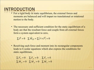 The document discusses determining the forces acting on a rigid body in static equilibrium. It provides three key points: