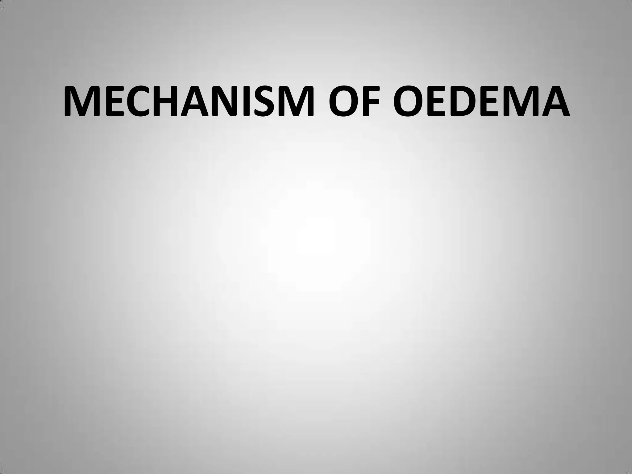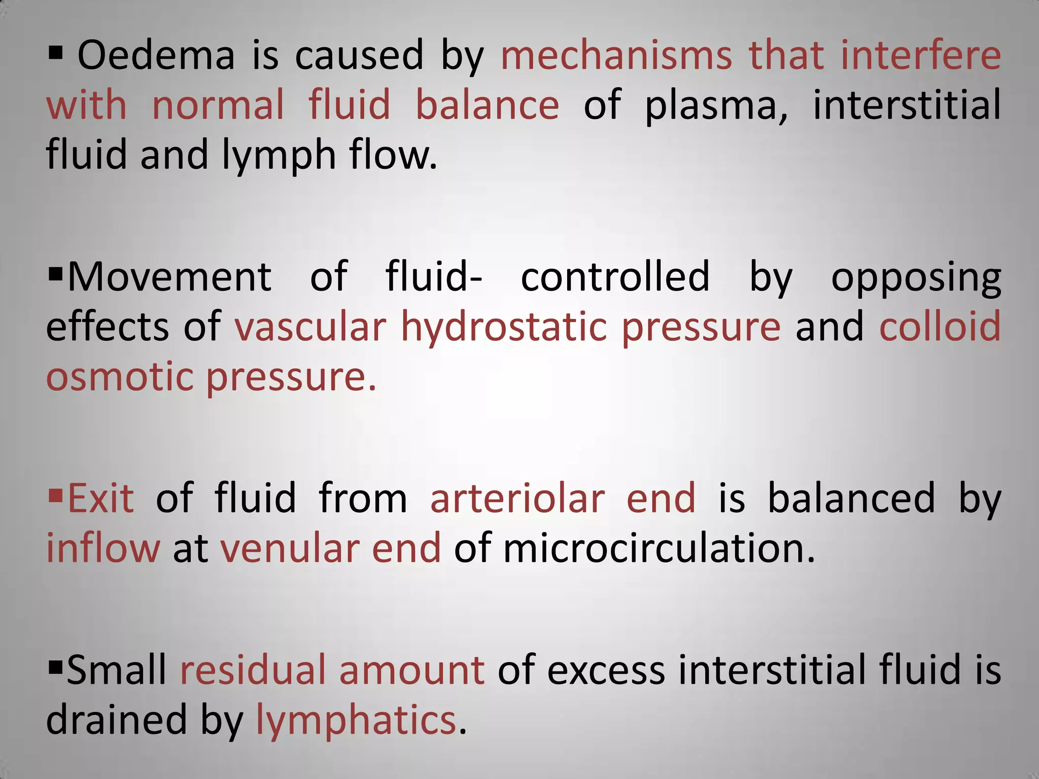 Oedema is caused by mechanisms that interfere with normal fluid balance between plasma, interstitial fluid, and lymph flow. Fluid movement is controlled by opposing effects of vascular hydrostatic pressure and colloid osmotic pressure, where excess interstitial fluid is normally drained by lymphatics. Oedema can result from increased capillary hydrostatic pressure, reduced plasma oncotic pressure due to low albumin, lymphatic obstruction impairing drainage, sodium and water retention in the kidneys, or inflammation causing capillary leakage.