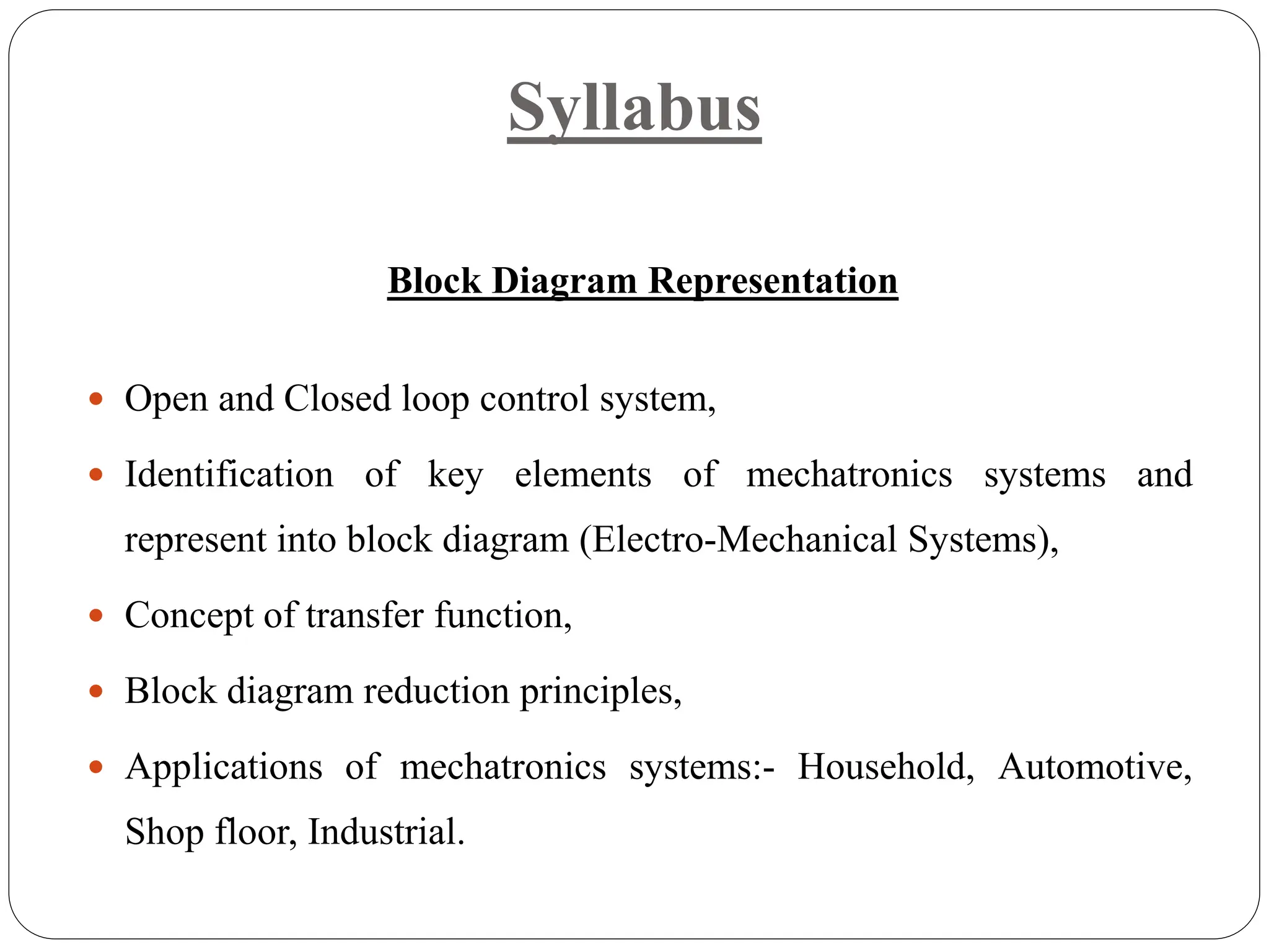 The document outlines lecture notes on mechatronics, covering control systems, key elements, representations as block diagrams, and various applications in industries. It emphasizes understanding concepts such as transfer functions, PID control, PLC systems, and the differences between open and closed-loop control systems. The document also includes objectives, outcomes, and references for further reading in the field of mechatronics.