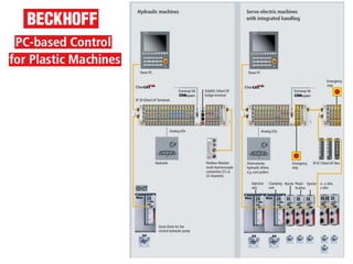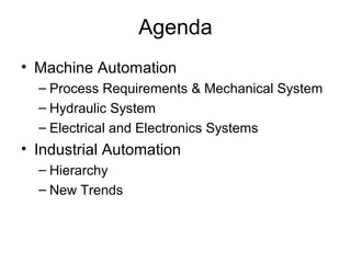 The document discusses machine automation and industrial automation as applied to injection moulding machines. It covers the mechanical, hydraulic, electrical, and electronic systems used in machine automation, including clamping systems, injection units, and hydraulic and servo-hydraulic systems. It also discusses industrial automation hierarchy and trends, including PLCs, HMIs, communications protocols, and the different levels of industrial automation from enterprise systems down to field devices and sensors.