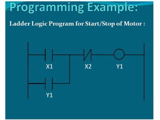 This document provides an overview of Programmable Logic Controllers (PLCs), describing their architecture, major components, input/output processing, and programming methods, particularly ladder logic. It outlines key functionalities such as timing, counting, latching, and sequencing operations, while also emphasizing the importance of understanding sinking and sourcing for input/output modules. Additionally, it highlights various applications of PLCs across different industries, including robotics, manufacturing, and food processing.