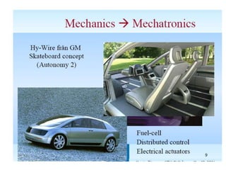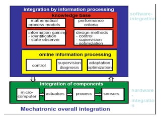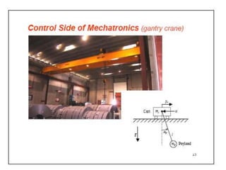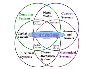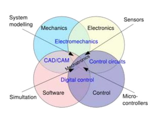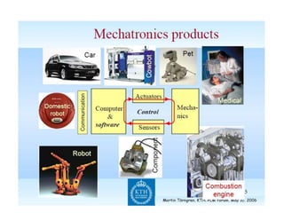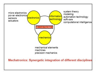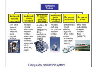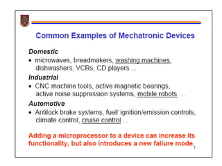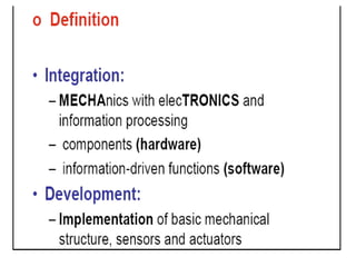This document provides an overview of the Mechatronics and Microprocessor course for the 6th semester of a Mechanical Engineering program. It includes information on the course chapters and units which cover topics like transducers, sensors, actuation systems, signal conditioning, microprocessors, logic functions, and central processing units. It also lists two recommended textbooks for the course. The document then delves into some of the unit topics at a higher level of detail, providing definitions and examples of mechatronic systems, components, and applications.