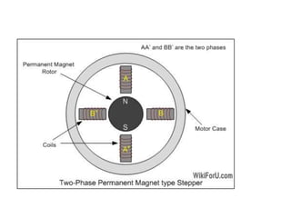 The document discusses various types of actuators and motors used in mechatronics systems design including stepper motors, servo motors, DC motors, and AC induction motors. It describes their working principles and applications. It also outlines the stages of the mechatronics design process from problem analysis to implementation. Examples of mechatronic systems are provided such as a pick and place robot, engine management system, and automatic car park barrier.