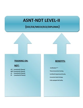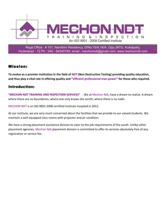 Mechon NDT is an ISO-certified training institute that aims to provide quality education and professional manpower in non-destructive testing (NDT). It offers NDT Level II certification training courses in liquid penetrant testing, magnetic particle testing, ultrasonic testing, and radiographic testing. The training is conducted according to ASNT standards by experienced faculty and includes both theoretical and practical components, with the goal of qualifying personnel and upgrading their NDT knowledge according to national and international standards. Upon completion of the training, participants will receive an ASNT-recognized certification that is valid globally.
