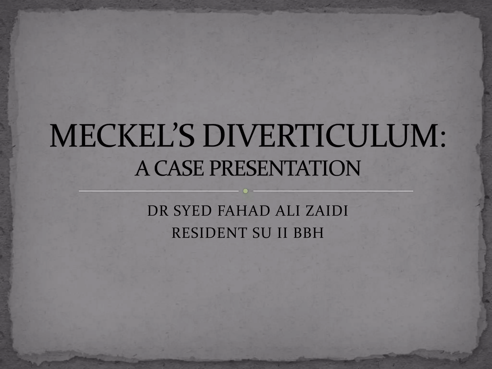 This document describes a case of a 12-year-old female who presented with abdominal pain and signs of peritonitis. She underwent an exploratory laparotomy which revealed a Meckel's diverticulum with gastric mucosa and a jejunal perforation. She had a complicated postoperative course requiring a second surgery. Meckel's diverticulum is a common congenital abnormality caused by incomplete vitelline duct obliteration. It can contain heterotopic gastric or pancreatic mucosa and commonly presents in children with GI bleeding. Surgical resection is often required for complications like perforation or obstruction.