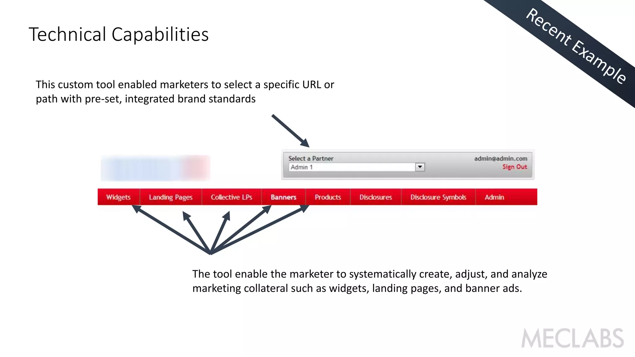 The MECLABS Technology Group developed a custom technology solution for a multinational banking and financial services company that allows their marketing team to efficiently create, manage, and track marketing campaigns. This tool features integrated brand standards, guiding creation processes, built-in creative design capabilities, and simplifies the management of various marketing collateral. The user-friendly dashboard facilitates easy adjustments and editing of multiple creatives and campaigns.