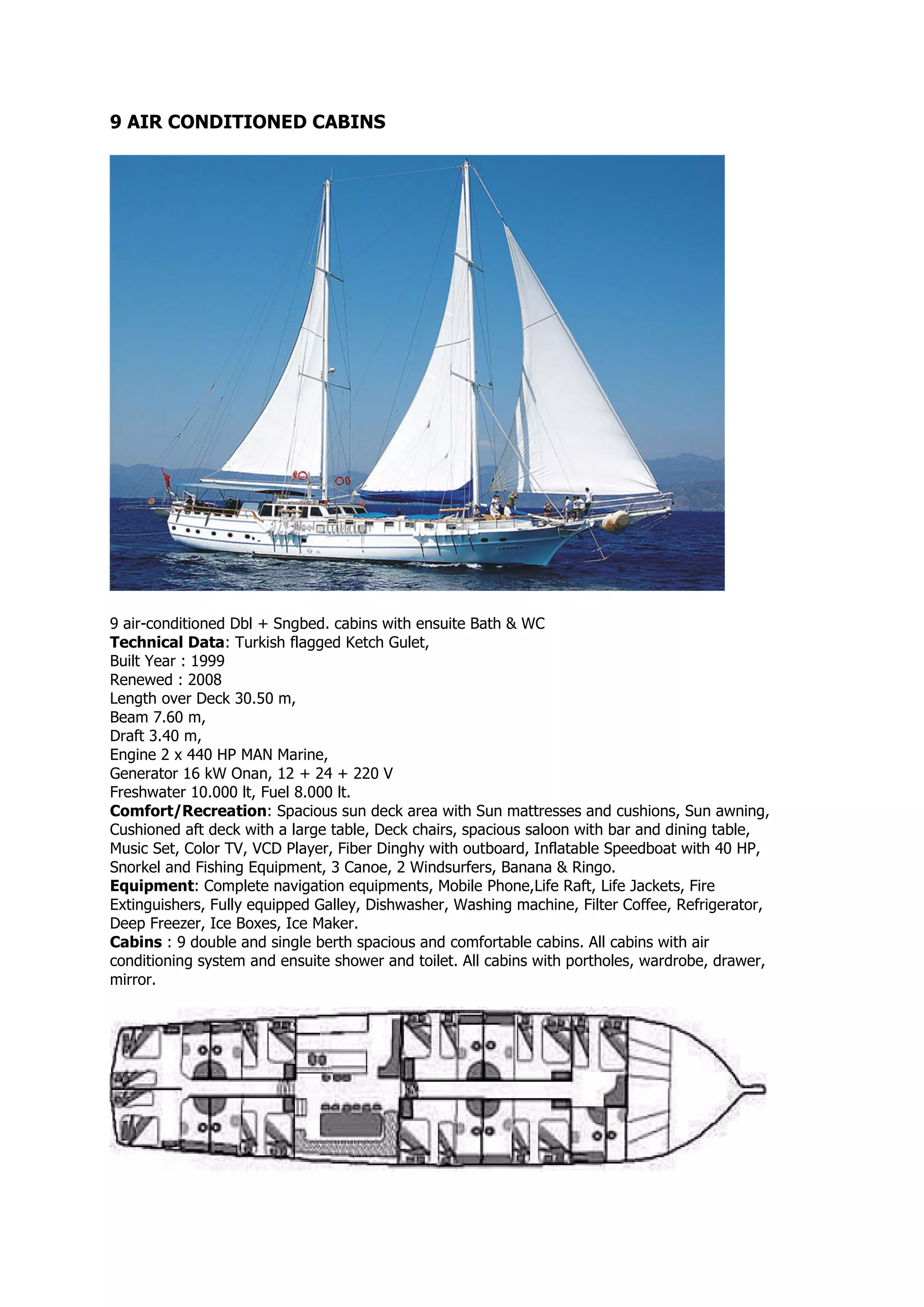 This document summarizes the features of a 30.5 meter Turkish flagged ketch gulet built in 1999 and renovated in 2008. It has 9 air-conditioned cabins with private bathrooms, a spacious sun deck and seating areas, a dining area and bar inside, and equipment for water sports and fishing. It is powered by twin 440HP engines and has generators, navigation equipment, and amenities for comfortable living onboard.