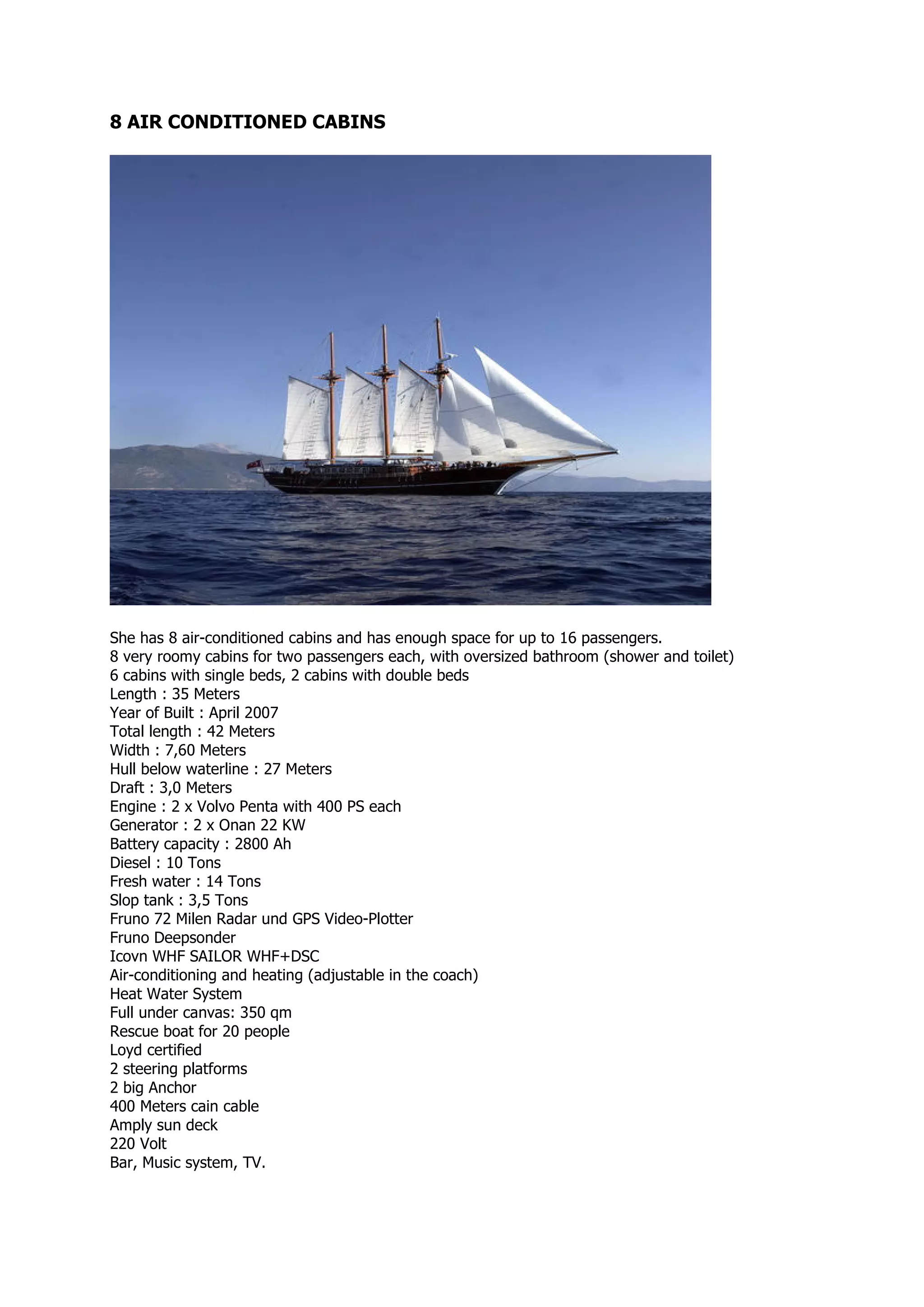 This 35-meter yacht has 8 air-conditioned cabins that can sleep up to 16 passengers. It has 6 cabins with single beds and 2 cabins with double beds, as well as a large bathroom with shower and toilet. The yacht was built in April 2007 and is powered by 2 Volvo Penta engines with 400PS each. It has various navigation equipment, air conditioning, heating, and amenities like a bar and music system.