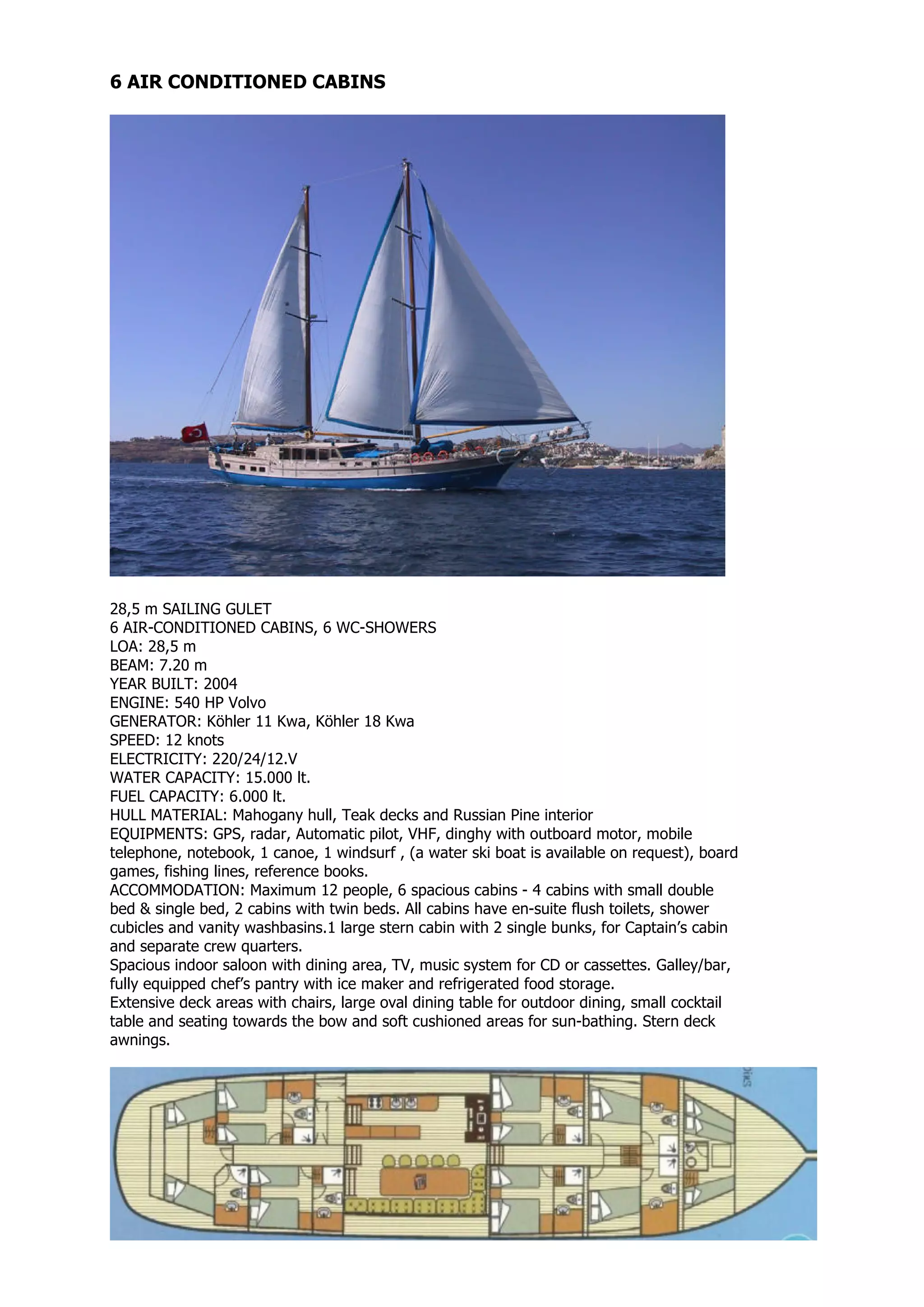 The document summarizes the specifications of a 28.5 meter sailing gulet with 6 air-conditioned cabins. It has 6 WC-showers, was built in 2004, has a 540 HP engine, generators, and can reach speeds of 12 knots. It has mahogany hull and teak decks, along with equipment like GPS, radar, and mobile phone. The accommodation includes 6 spacious cabins that can sleep up to 12 people total, along with indoor and outdoor dining and lounge areas.