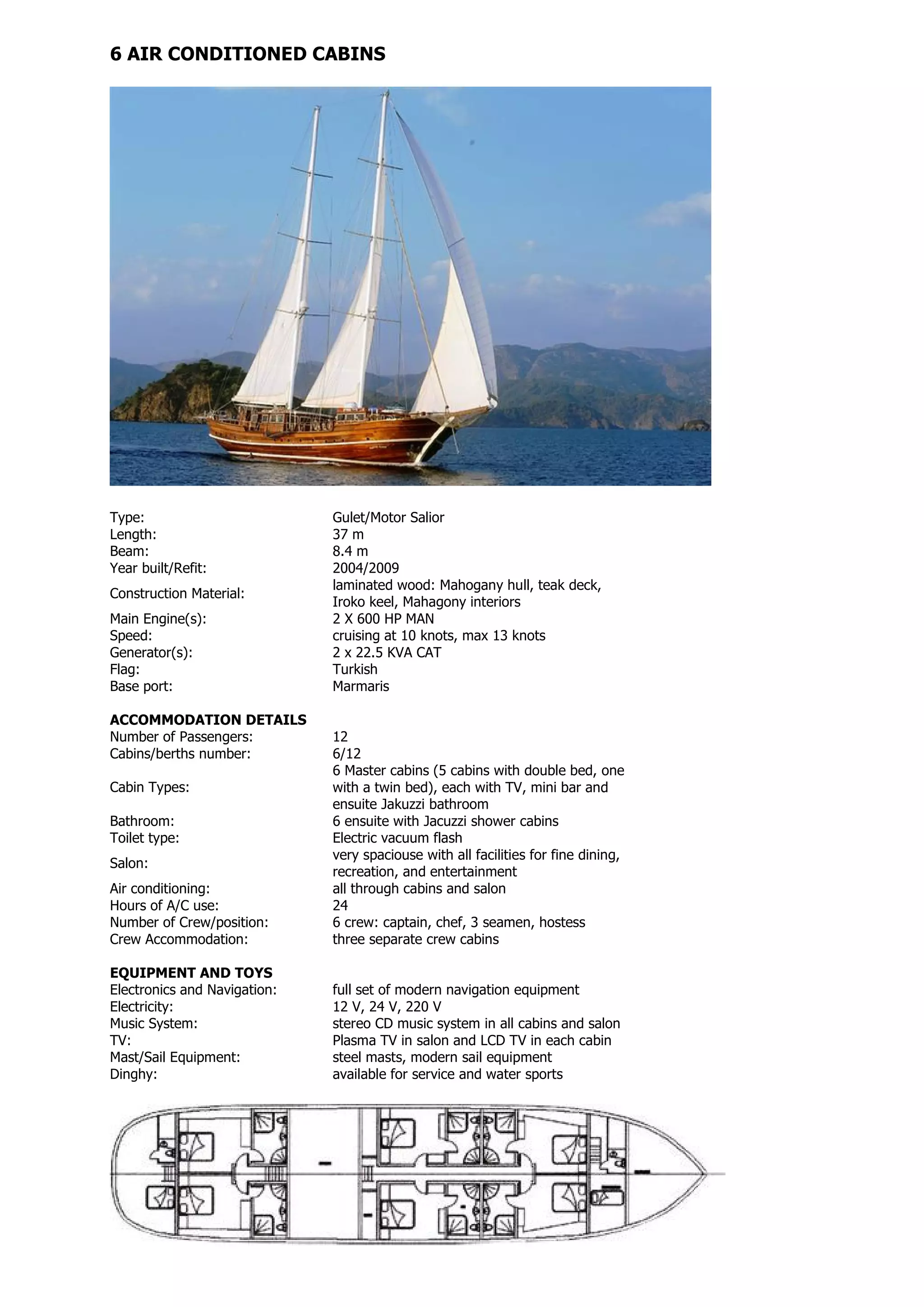 The document provides details on a 37 meter motor yacht built in 2004 that has 6 air conditioned cabins that can accommodate up to 12 passengers, with each cabin having a private ensuite bathroom, as well as specifications on its engines, generators, electronics, and amenities including a music system, televisions, and dinghy. The yacht has a crew of 6 who reside in separate crew quarters and can cruise at 10 knots or reach a top speed of 13 knots.
