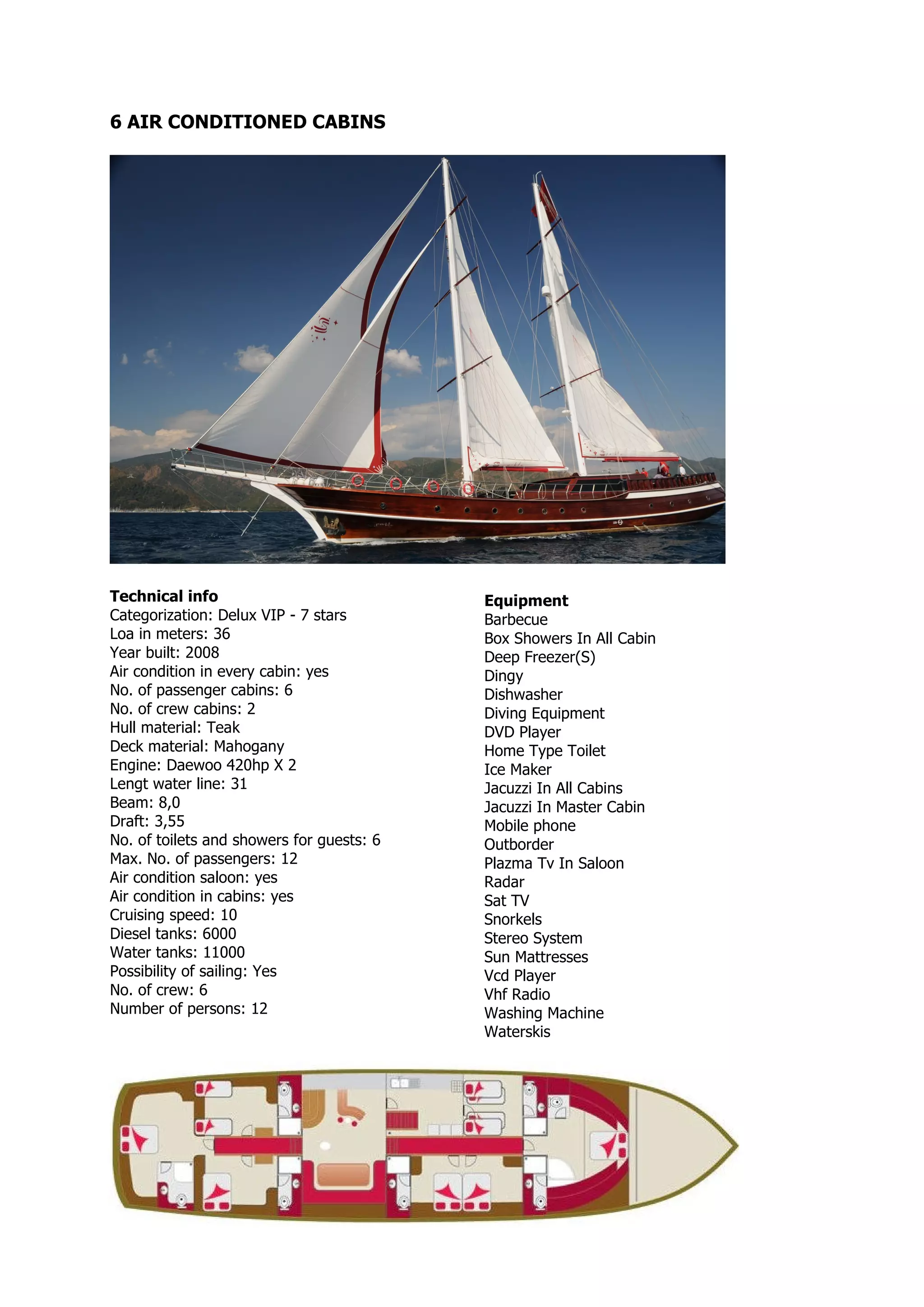 This luxury yacht has 6 air conditioned cabins that can accommodate up to 12 passengers, along with 2 crew cabins. Built in 2008 with a teak hull and mahogany deck, it has powerful engines, many amenities like showers, toilets, and entertainment systems in each cabin as well as in the saloon, and is suitable for both leisure cruising and water sports.