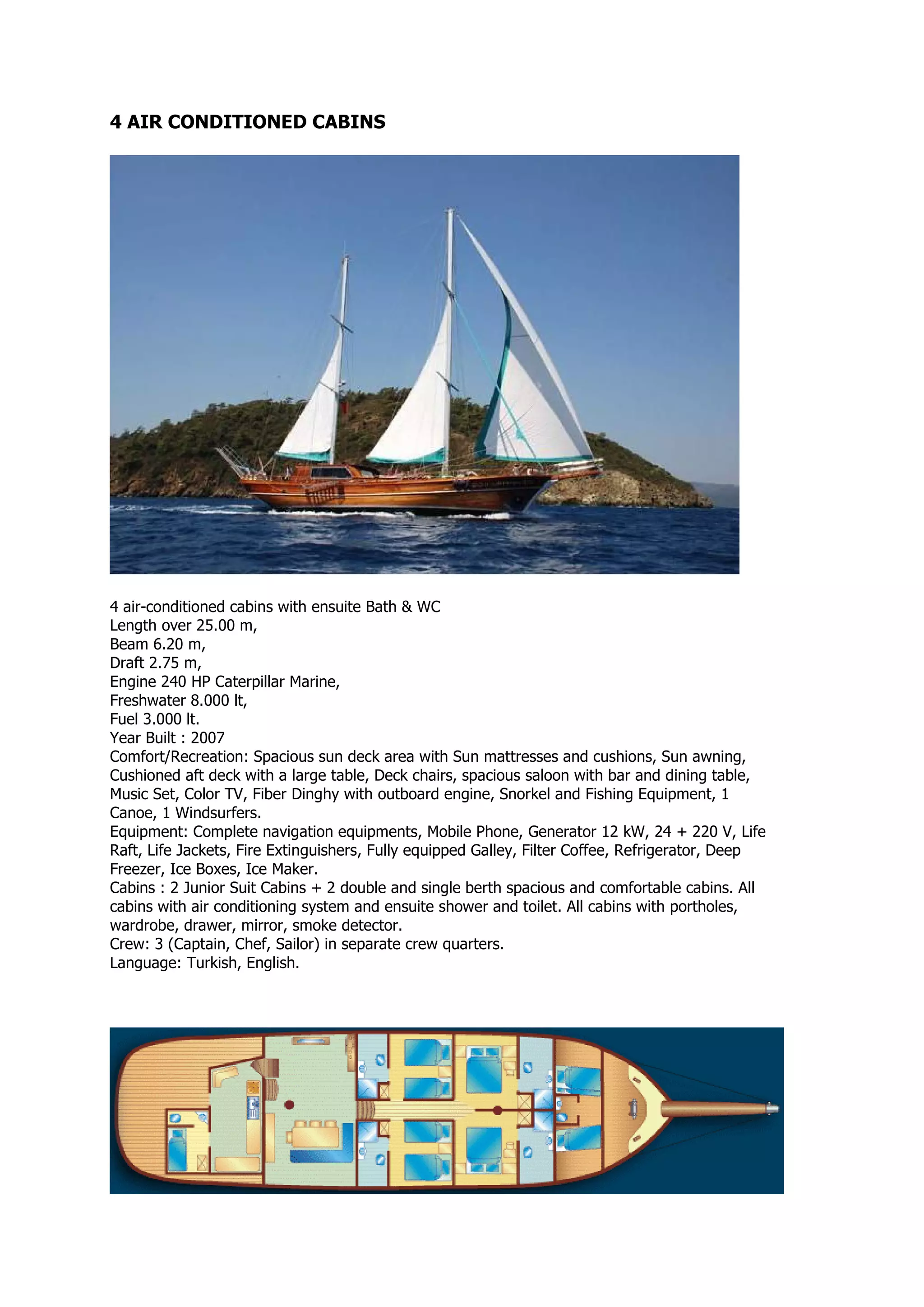 This document summarizes the features of a luxury yacht with 4 air-conditioned cabins. It includes details about the yacht's dimensions, engine, fuel and water capacity, and year built. Amenities include a spacious sun deck, aft deck with table, saloon, TV, and equipment for water sports. The yacht has navigation equipment, generator, life raft and more. Its 4 cabins each have air conditioning, ensuite bathroom, and sleeping capacity ranges from single to double berths. It carries a crew of 3 in separate quarters and services are provided in Turkish and English.