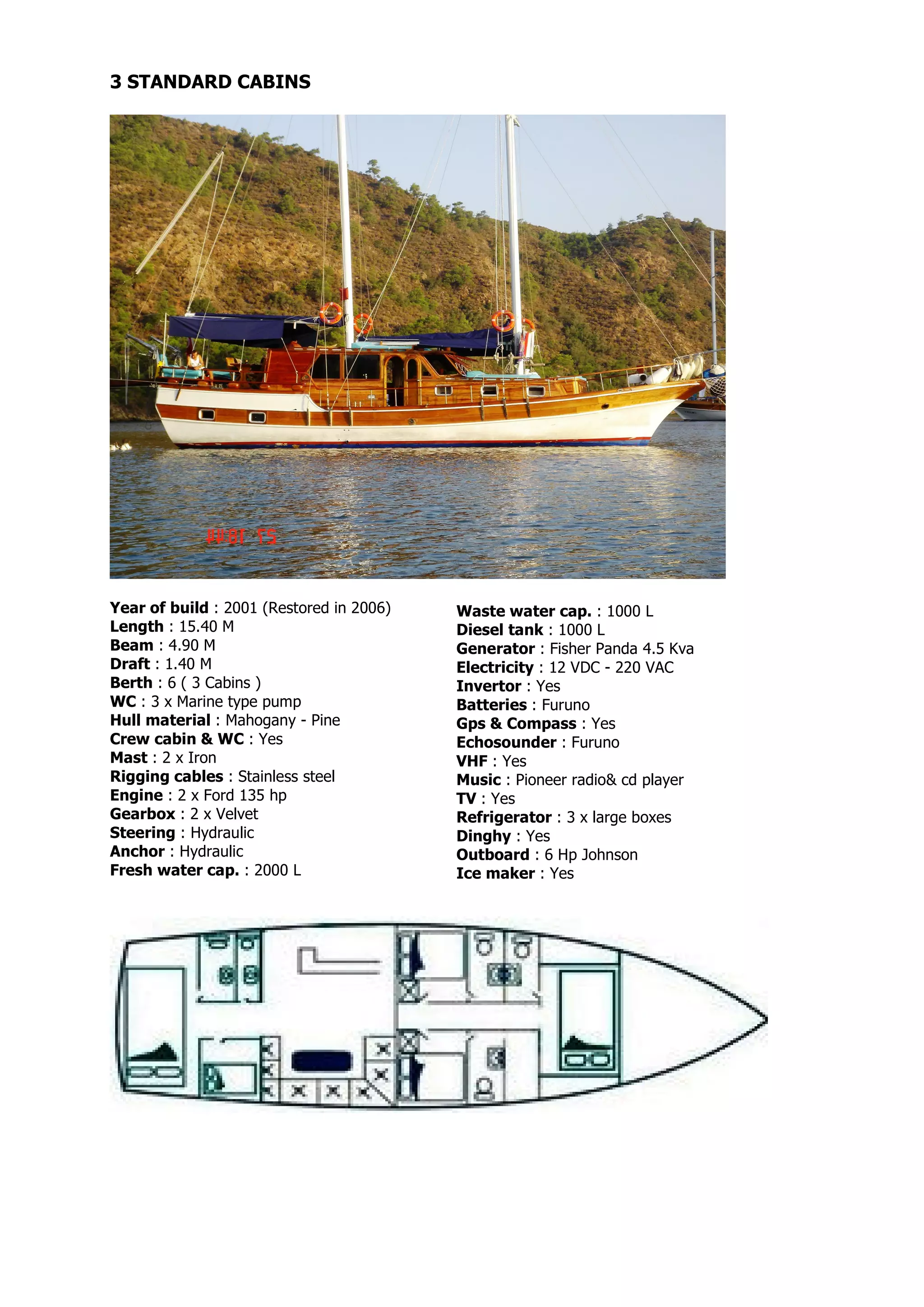 This 15.4m yacht built in 2001 and restored in 2005 has accommodations for 6 guests in 3 cabins and space for a crew cabin. It is powered by twin 135hp Ford engines and equipped with amenities like a Furuno GPS and echo sounder, 12V/220V electricity from a Panda generator, fresh and waste water tanks, refrigeration, and entertainment systems. Safety and navigation equipment includes a hydraulic anchor and steering, VHF radio, and stainless steel rigging.