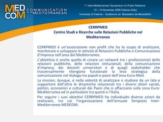 Il 1° simposio inter-mediterraneo sulle relazioni pubbliche si è tenuto a Catania dal 13 al 14 novembre 2009, con l'obiettivo di promuovere il dialogo tra i professionisti delle relazioni pubbliche dell'area euro-mediterranea. Il tema centrale è stato il supporto delle relazioni pubbliche allo sviluppo economico dei paesi del Mediterraneo, evidenziando l'importanza della comunicazione nel rafforzare le interazioni tra i diversi attori sociali. L'evento ha raccolto relatori di spicco e ha cercato di creare una piattaforma di dialogo costruttivo per costruire una reciproca comprensione tra i popoli della regione.