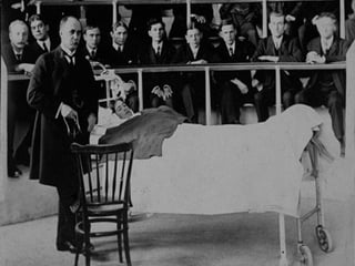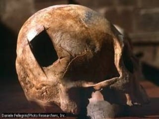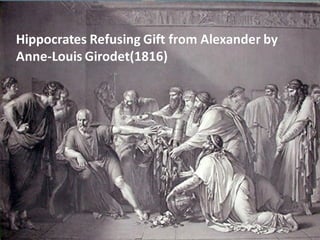 The document provides an overview of the history of medicine from prehistoric times through the Middle Ages. It discusses early medical practices like trepanning and the role of shamans. It profiles important early physicians like Imhotep, Hippocrates, and Galen and how they advanced medical knowledge. It describes the decline of medicine during the Dark Ages and its later emergence at Salerno. Key developments included the influence of Arabic medicine and the rise of university medicine in Europe.